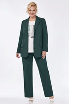 Жакет с округлым вырезом горловины, спущенной линией плеча и центральной застёжкой на петли и пуговицы. Перед с накладными карманами с отделкой в верхней части. Рукава втачные со складками по окату и манжетами по низу. Жакет на подкладке.