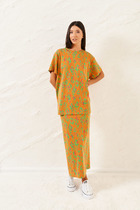 Юбка на поясе с резинкой. Переднее полотнище с отделочной деталью из контрастной ткани и шлицей. Заднее полотнище с потайной молнией в среднем шве. Юбка на подкладке.