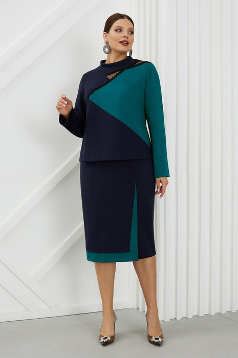 Джемпер с воротником стойкой. Перед с дизайнерскими отрезными деталями и с декоративной тесьмой и сеткой в верхней части.  Спинка с талиевыми вытачками. Рукава втачные.