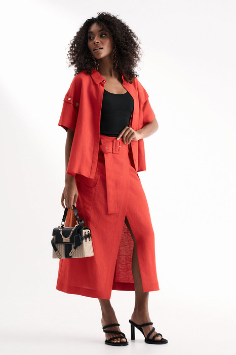 Юбка на притачном поясе и  со съёмным поясом из основной ткани по талии. Изделие с застёжкой на кнопки и потайные пуговицы по переду в верхней части.  Переднее полотнище с накладными карманами с клапанами. Заднее полотнище с кокеткой и средним швом.