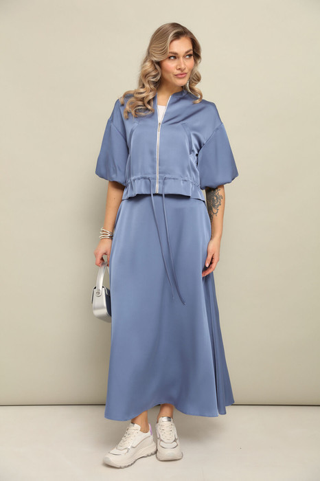 Комплект 2ка, состоящий из укороченного бомбера и юбки.  Бомбер с застёжкой на молнию и объёмными рукавами. Линия талии на кулисе и завязке из основной ткани . Юбка кроя трапеция, длина макси. Длина юбки 90-92 см. Длина бомбера 48-49 см.