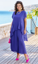 Костюм 2ка, состоящий из жилета и брюк. Удлиненный приталеный жилет с отложным вортником и лацканами. Застёжка центральная на пуговицу и петлю. По бокам выполнена имитация карманов с калапанами. Нижняя часть жилета состоит из двух слоёв: верхний -из лёгкой шифоновой ткани со стразами, нижний- из основной ткани . Длина по спинке 83-85 см. Брюки свободного прилегания по бедрам и зауженные к низу. Пояс на эластичной тесьме с кулисой и втянутым шнурком. Вход в карман фигурный, наклонный к боковому шву.