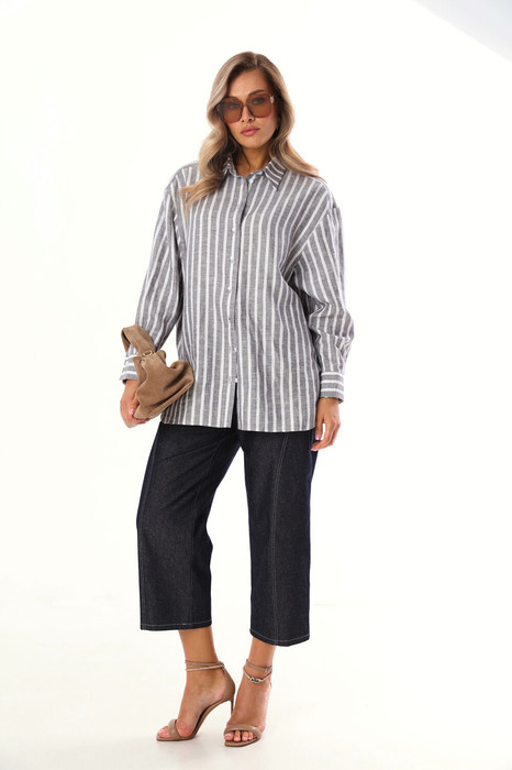 Комплект 2ка, состоящий из рубашки и брюк. Рубашка женская большого объема, прямого силуэта. На детали спинки расположена двойная кокетка, переходящая на деталь полочки. Под кокеткой на спинке встречная складка. Воротник рубашечный отложной на стойке. Застежка планка центральная на прорезные петли и пуговицы. Линия плеча спущенная, рукав рубашечный, длинный. В нижней части рукава заложены складки, заканчивается манжетой с двумя прорезными петлями и пуговицами. Низ блузки разноуровневый: спереди короче, сзади длиннее. Брюки капри, зауженные и укороченные к низу, выполнены из джинсовой ткани. По переду и сзади расположены карманы. Застежка на пуговицу и молнию.