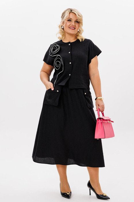 Комплект 2ка, состоящий из блузки и юбки. Укороченная блузка с короткими рукавами и застёжкой на пуговицы. Вырез горловины круглый. По переду блузки выполнен декор из основной ткани в виде цветов. Юбка - силуэта «трапеция», широкого объёма, длина миди, талия на резинке. Спереди юбка дополнена уникальными карманами, входящими в талиевый шов и свободно висящие по низу.