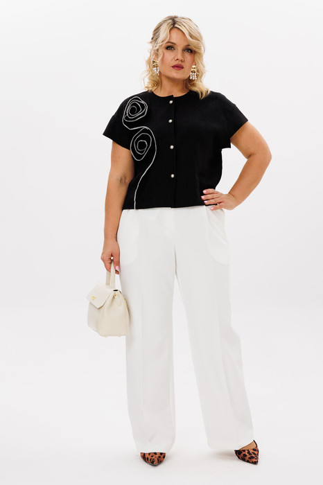 Комплект 2-ка, состоящий из блузки и брюк. Укороченная блузка с короткими рукавами и застёжкой на пуговицы. Вырез горловины круглый. По переду выполнен декор из основной ткани в виде цветов.  Брюки широкого объема, прямого силуэта. На передних половинках брюк заутюжены стрелки, переходящие в складки по линии талии. На задних половинках также заутюжены стрелки. В боковых швах расположены карманы. Застежка-гульфик. Пояс отрезной, притачной. В задней части пояса вставлена эластичная тесьма (резинка). На пояс настрочены шлевки. Выступающая часть пояса застегивается на петлю и крючок.