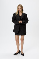 Комплект 2ка, состоящий из жакет и брюк. Жакет большого объёма с двубортной застежкой по одной стороне на петли и пуговицы. Рукава 3/4 с манжетами. Жакет без подкладки. По переду расположены накрадные карманы. Брюки широкого объема. По центру переда заложены две широкие встречные складки на каждой половинке. В боковых швах расположены карманы с наклонным входом. Талия на резинке.