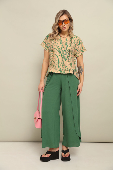 Комплект 2ка, состоящий из блузки и брюк. Блузка свободного силуэта с короткими рукавами. Горловина V-образная. Низ блузки разноуровневый: спереди короче, сзади длиннее.  Широкие брюки-кюлоты свободного оригинального кроя с застёжкой на пуговицы. Без карманов и боковых швов (на запах).