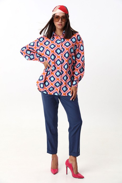 Комплект 2ка, состоящий из рубашка и брюк. Рубашка женская большого объема, прямого силуэта. На детали спинки расположена двойная кокетка, переходящая на деталь полочки. Под кокеткой на спинке встречная складка. Воротник рубашечный отложной на стойке. Застежка планка центральная на прорезные петли и пуговицы. Линия плеча спущенная, рукав рубашечный, длинный. В нижней части рукава заложены складки, заканчивается манжетой с двумя прорезными петлями и пуговицами. Низ блузки разноуровневый: спереди короче, сзади длиннее. Удобные повседневные брюки из лёгкой ткани с вискозой в составе. Брюки свободного прилегания по бедрам и зауженные к низу. Пояс на эластичной тесьме с кулисой и втянутым шнурком. Вход в карман фигурный, наклонный к боковому шву. Рост фотомодели 175 см. Размер у фотомодели – 44.