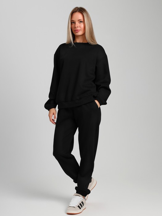 Костюм молодежный из гладкокрашенного трикотажного полотна «лининг», состоящий из джемпера и брюк. Джемпер – свободного покроя, с длинными втачными рукавами, горловиной овальной формы, обработанной втачной планкой, состоящей из двух частей. Окантованные нижние срезы рукавов, планка горловины и пояс из полотна «кашкорсе» такого же цвета, как и основной материал. Притачной пояс выполнен с вложением эластичной тесьмы, регулируемой по длине фиксаторами.Брюки – длинные, с карманами в боковых швах, на притачном поясе с эластичной тесьмой внутри, в левом боковом шве вставлен декоративный элемент. Нижние срезы обработаны подгибкой с вложением эластичной тесьмы.