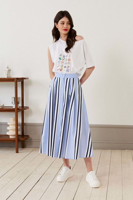 Комплект юбочный. Футболка с асимметричными рукавами, спереди выполнена декоративная вышивка. Юбка расклешенного А-силуэта из тончайшего хлопка, длина миди. Застежка по центру по всей длине на планку с пуговицами. Пояс втачной.