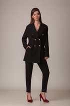 Костюм брючный состоит из блузы и брюк. Блуза из натуральной вискозы на хлопковой подкладке. Блуза без рукавов, воротник пиджачного типа, застёжка на петли и пуговицы. По всей линии талии резинка, низ блузы на сборке и обработан подкладкой. Брюки прямого силуэта, заутюженные на кант. По линии талии притачной пояс, застёжка на молнию и петлю-пуговицу. В боковых швах прорезные карманы.