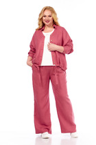 Костюм состоит из жакета и брюк. Жакет прямого силуэта, линия плеча спущена, рукав короткий, по низу рукава отложные манжеты с окантовкой в красном цвете. Округлый вырез горловины. Застежка глубокая, двубортная на петлю и пуговицу, низ борта округлой формы. Брюки на притачном поясе, по переду складки, застежка на молнию. В боковых швах прорезные карманы, по низу брюк отложная манжета.