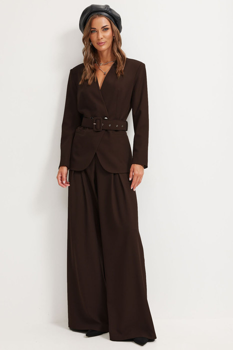 Жакет полуприлегающего  силуэта из костюмной ткани.  Жакет с двубортной застежкой и  V-образным вырезом  горловины. Рукав втачной  двухшовный. По переду функциональные  карманы с листочкой, рельефы  и нагрудные вытачки.  На спинке средний шов и талиевые вытачки. Жакет на подкладке. В комплект входит ремень. Обращаем ваше внимание, что фурнитура может отличаться от фото.