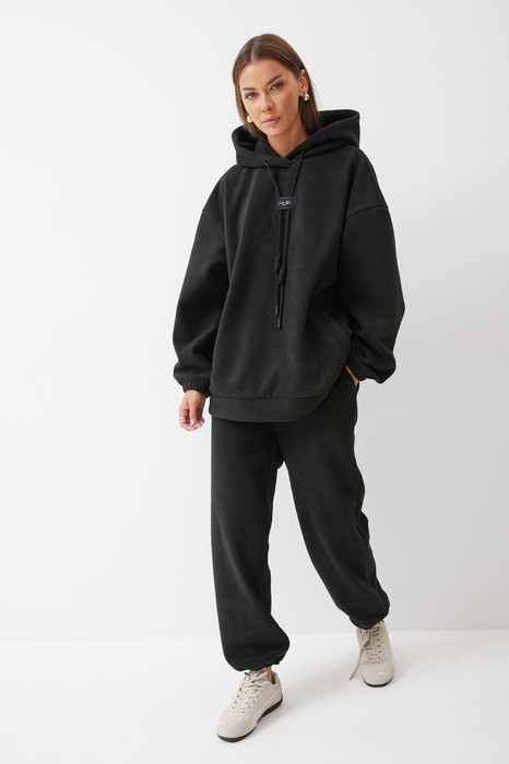 Костюм состоящий из джемпера и брюк. Джемпер прямого силуэта из комфортного трикотажного полотна. Горловина обработана капюшоном. Рукав со спущенной линией плеча, по низу на резинке. По низу джемпера притачной пояс. По переду декоративная нашивка и шнур.