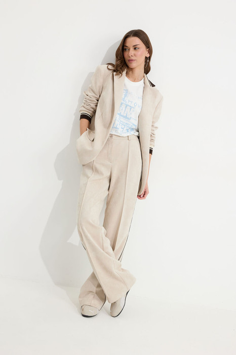 Брюки прямого силуэта из трикотажного полотна “замша”. По верху притачной пояс с застежкой на петлю и пуговицу и шлевками для ремня. На передних половинках обработаны карманы, канты и застежка молния в среднем шве, на задних – вытачки. По поясу задних половинок брюк эластичная тесьма(резинка) . Вдоль бокового шва брюк  лампас. Обращаем ваше внимание, что фурнитура может отличаться от фото. Декоративный элемент - цепочка в комплектацию не входит.