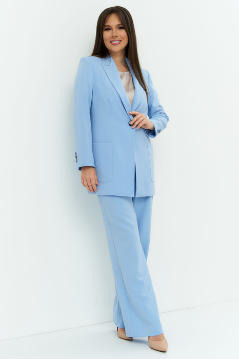 Стильный комплект из жакета, блузы и брюк. Удлиненный жакет прямого кроя, на подкладке с центральной застежкой на пришивную пуговицу. Выполнен из костюмной ткани. Дополнен боковыми накладными карманами. Рукав встачной. Блуза прямого кроя, выполнена из шифона. Широкие брюки прямого кроя с притачным поясом, с застежкой на пришивную пуговицу и молнию. Посадка слегка завышена. Дополнены функциональными боковыми карманами. Длина жакета от плечевого шва 76 см. Дина рукава 60 см. Длина брюк 113 см