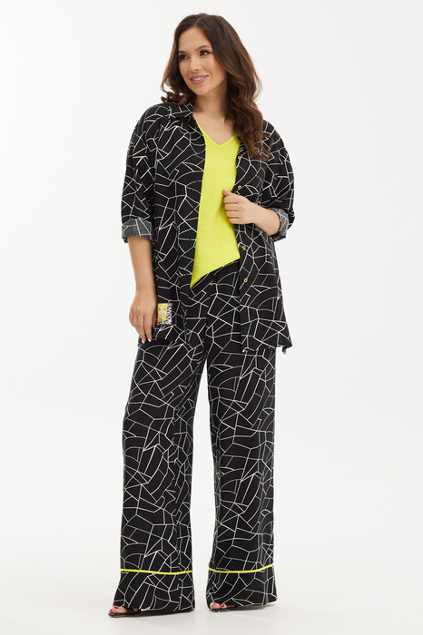Стильный и комфортный комплект из блузы, футболки и брюк. Блуза рубашечного кроя с отложным воротником и центральной застежкой на пришивные пуговицы. Рукав длинный, спущен, с притачной манжетой. Дополнена пришивной аппликацией (дизайн аппликации может отличаться от фото в зависимости от партии) Футболка прямого кроя с втачным коротким рукавом. Горловина V-образная. Выполнена из поливискозной ткани с легким атласным блеском. Свободные брюки прямого кроя с притачным поясом, дополненным эластичной тесьмой. По бокам расположены удобные карманы. По низу брюки с широким подворотом с отделкой из салатовой тесьмы. Застежка на молнию и пришивную пуговицу. Длина блузы от плечевого шва 77 см. Длина рукава 60 см. Длина топа от плечевого шва 60 см. Длина брюк по боковому шву 107 см.