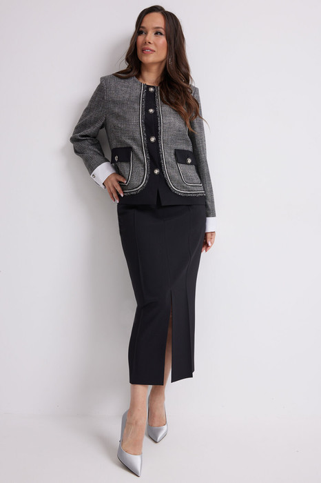 Стильный комплект из жакета и юбка. Жакет прямого кроя, на подкладке, с центральной застежкой на красивые пришивные пуговицы. Рукав втачной, дополнен съемными белыми манжетами. Выполнен жакет из красивой костюмной ткани. Юбка миди прямого кроя, на подкладке, с удобным разрезом спереди. Дополнена удобными боковыми и накладными задними карманами. Юбка с притачным поясом со шлевками для ремня, с застежкой по спинке на потайную молнию и пуговицу. Длина жакета от плечевого шва 60см. Длина рукава 60см. Длина юбки 83см.