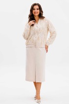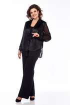 Стильный комплект из джемпера и брюк. Джемпер свободного кроя. Перед выполнен из гладкого трикотажного полотна в полоску. Спинка выполнена из плотной рубашечной ткани. Рукав втачной, слегка спущен. Дополнен притачными манжетами. Горловина округлой формы. По спинке джемпер длиннее. Удобные и очень практичные брюки свободного кроя, слегка заужены к низу, с притачным поясом, дополненным эластичной тесьмой и шлевками для пояса. Посадка средняя. Застежка гульфик на молнию и пуговицу. Выполнены из плотного трикотажного полотна. Брюки дополнены удобными боковыми и накладными задними карманми. Длина джемпера от плечевого шва по переду 65см, по спинке 72см. Длина рукава 60см. Длина брюк по боковому шву 98см.