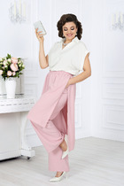 Комплект женский, состоящий из жилета и юбки. Жилетка со средним швом по спинке, переходящим в разрез. Завязывается сзади на пояс. По переду вытачки, переходящие в рельеф. V-образная горловина, фигурный низ, карманы с листочкой, функциональные, застежка на 4 пуговицы. Юбка А-силуэта со средним швом по спинке и переду. В боковых обработаны карманы, пояс на резинке, застежка на молнию и пуговицы.