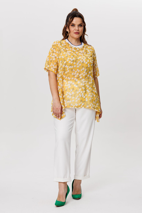 Комплект женский летний для повседневной носки, прекрасно сочетается с любой по стилю обувью и оба изделия комплекта могут смело сочетаться с другими изделиями Вашего гардероба. Блузка — свободного кроя, с коротким рукавом и ассиметричным низом  выполнена из шифона средней плотности, в качестве дополнительного декора на горловине — вязаный довяз. Брюки длиной 7/8, снизу на манжете, пояс на резинке. Длина блузки по спинке 65 см, длина рукава 28 см. Длина брюк по боковому шву 91 см, длина брюк по шаговому шву 60 см. Изделие подойдет на рост 170 см.