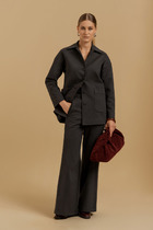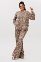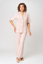 Костюм женский в комбинации двух видов полотен: из гладкокрашенного трикотажного вискозного полотна с эффектом «варенка», состоящий из футболки и брюк. Футболка - свободного покроя, с короткими цельнокроеными рукавами, горловиной V-образной формы, окантованной основным материалом и разрезами в боковых швах. Модной деталью является разница длин между полочкой и спинкой.Брюки – длинные, свободные, на притачном поясе с эластичной тесьмой внутри.