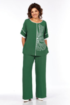 Костюм состоит из жакета и брюк. Жакет на подкладке с прорезными функциональными карманами по переду и застежкой на 2-е петли и пуговицы. Рукав втачной двухшовный со шлицей декорированной пуговицами. Брюки прямые от линии калена с застежкой спереди на молнию. Пояс с резинкой по бокам. Длина жакета 71 см, длина рукава 60 см, длина брюк 102 см