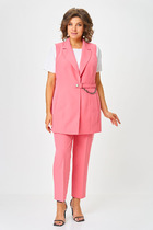 Летняя, стильная двойка. Именно этот комплект вам нужен. Комплект состоит из блузки и брюк. Блузка прямого силуэта выполнена из вискозной ткани. С контрастной оранжевой отделкой лампас по плечевому срезу и рукаву, клапану и мешковине кармана. Спущенная линя плеча, рукав короткий с отложной манжетой. По левой полочке заложена складка и имитация кармана. Спинка со средним швом. По бокам имеются разрезы. Застёжка центральная на 5 пуговиц и петель. Брюки прямого силуэта, на притачном поясе с резинкой, по бокам расположены наклонные карманы. По брюкам прострочены контрастные отделочные строчки.