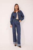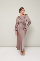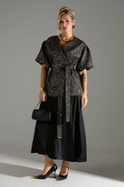 Комплект женский 2-ух предметный, состоящий из жакета и юбки. Жакет со спущенной линией плеча и цельнокроеным рукавом. По переду отрезная кокетка, воротник- стойка, рукава и планки. По переду настрочены нагрудные клапаны. Синка со средним швом. На левом рукаве о низу настрочена нашивка. Центральная застежка по планкам на 5 пуговиц и петель. Низ жакета можно регулировать с помощью эластичного шнура и фиксатора. Жакет без подкалки. Юбка на широкой обтачке А- силуэта, на подкладке. По переднему и заднему полотнищу заложены складки. По бокам расположены наклонные карманы. Застежка сзади на потайную тесьму-молни