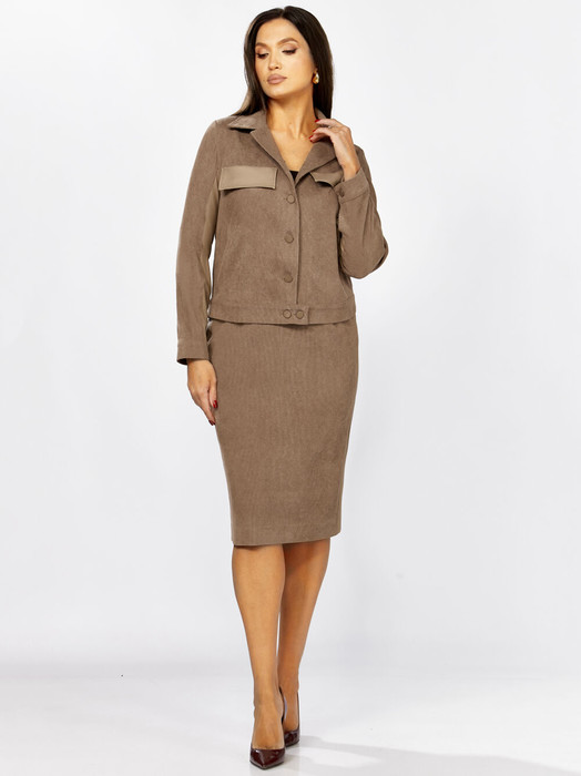 Комплект женский 2-х предметный состоящий из жакета и юбки выполненного из вельвета в мелкий рубчик. Жакет прямого силуэта с нагрудными клапанами из экокожи. В рельефе вертикальные прорезные функциональные карманы. Спинка с отрезной кокеткой и средним шмом. Рубашечный воротник. Рукав втачной двухшовный с вставкой из экокожи, по низу рукава манжета с 1 пуговицей и петлей. Застежка центральная на 6 пуговиц и петель. По низу спинки паты с 1 пуговицей. Жакет без подкладки. Длина рукава - 60 см, длина по спинке-55см. Юбка прямого силуэта с разрезом сзади, на подкладке. По бокам вставка из экокожи. Юбка на притачном поясе, по бокам эластичная резинка. Застежка сзади на потайную тесьму-молнию и пуговицу. Длина юбки по боковому шву- 64 см.