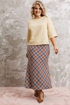 Костюм женский, состоящий из блузы и брюк. Блуза прямого силуэта, с разрезами по бокам. Рукав цельнокроеный, заканчивается притачной манжетой. Горловина V-образная с притачной планкой по линии переда, спинки и рукава. Головина на завязке. Дополнением служит пояс. Брюки по силуэту с легким клешем от колена, по передним половинкам по центру застрочен защип. Карманы боковые накладные. Брюки с застежкой на молнию. Притачной пояс застегивается на петлю-пуговицу и с резинками по бокам. Модель без подкладки.