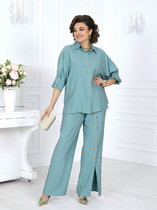 Костюм трикотажный женский состоит из джемпера и юбки нан подкладке. Джемпер прямого силуэта со спущенным втачным рукавом. В боковых швах обработаны разрезы. Горловина - цельнокроенная стойка. Юбка миди. Зауженная к низу. Спинка со средним швом, заканчивающимся разрезом. Талия обработана притачным поясом на резинке.