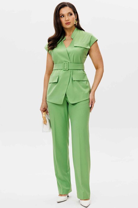 Костюм женский, состоящий из жилета и брюк. Жилет полуприлегающего силуэта, без подкладки. Плечо спущенное.Вырез V - образный, с воротником стойкой. по переду иммитация карманов с клапаном. Центральная застежка на пришивные кнопки.  Спинка со средним швом и вытачками. Брюки прямого силуэта, слегка зауженные к низу. Пояс частично на резинке (по бокам), с шлевками для ремня. Застежка на гульфик с молнией и внутренним крючком. По бокам боковые карманы с косым входом, сзади декоративные прорезные карманы «в рамку». Материал костюма костюмный, средней плотности, с гладкой фактурой. Без подкладки. Дополняет модель широкий пояс.