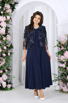 Женский брючный костюм, состоящий из жакета и брюк. Жакет полуприлегающего силуэта, двубортный, с застежкой на две пуговицы. Воротник английский. Рукав втачной, из кружевной ткани, заканчивается манжетой на пуговице. По бокам рельефные швы, формирующие силуэт. На уровне груди предусмотрены нагрудные вытачки. Брюки прямого силуэта, слегка зауженные к низу. Пояс частично на резинке (по бокам), с шлевками для ремня. Застежка на гульфик с молнией и внутренним крючком. По бокам боковые карманы с косым входом. Материал костюма костюмный, средней плотности, с гладкой фактурой. Без подкладки. Дополняет модель широкий пояс.