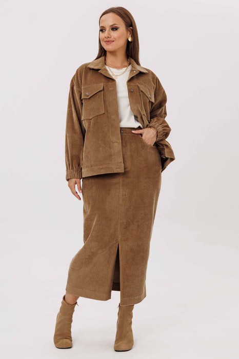 Комплект женский свободного силуэта состоит из бомбера и юбки. Бомбер со спущенными плечами застёгивается на прорезные петли и пуговицы. По переду прорезные карманы с широкой листочкой и накладные карманы с фигурными клапанами на застёжке. Воротник отложной. Рукава одношовные втачные на манжете. Юбка женская слегка зауженная к низу на притачном поясе со шлёвками, который застёгивается на прорезную петлю и пуговицу. По переду застёжка на молнию с гульфиком и откоском и карманы. По спинке центральный шов, заканчивающийся разрезом, кокетка и накладные карманы. Юбка и бомбер без подкладки.