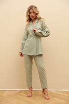 Элегантный женский костюм, состоящий из жакета и прямых брюк, выполнен из костюмной однотонной ткани. Жакет однобортный, на петлях и пуговицах, с английским воротником и клапанами по бокам. Рукав втачной, длина — полная. Посадка свободная, что обеспечивает комфорт и стильный силуэт. Брюки прямого кроя, на частичной резинке по поясу для удобной посадки и идеального прилегания. Костюм на подкладке, лёгкий, приятный к телу и подходит как для повседневной носки, так и для офиса или торжественного выхода.