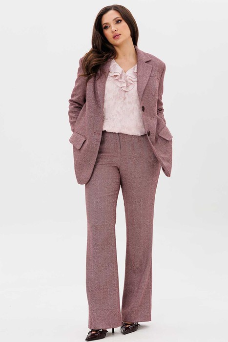Костюм женский, состоящий из жакета и брюк. Жакет прямого силуэта, на подкладке. Воротник стоячий отложной, с лацканами. Рукав втачной, с иммитацией шлицы по низу. Борта закругленные. На левом борту жакета обработана листочка. Карманы прорезные, в рамку с фигурным клапаном. Спинка со средним швом, заканчивающимся шлицей. Брюки полуприлегающего силуэта, расширенные от колена. Пояс притачной с широкими шлевками. Застежка в среденм шве переда на молнию и два крючка. Брюки с  боковыми карманами.