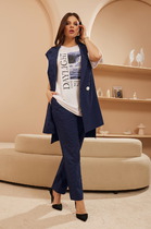 Комплект женский состоит из жакета и юбки. Жакет полуприлегающего силуэта удлинённый, с центральной застёжкой на две прорезные петли и пуговицы.  Перёд жакета с нагрудными вытачками, рельефами от проймы до низа и прорезными карманами с одним декоративным клапаном. Лацканы классической формы. Спинка со средним швом, рельефами от проймы до низа, которые заканчиваются шлицами с разрезом. Рукава втачные двух шовные. Жакет на подкладке. Юбка, слегка зауженная к низу на притачном поясе. Застёжка молния с гульфиком и откоском расположена в центральном шве передней части юбки. По спинке талевые вытачки. В пояс юбки по спинке продета тесьма резинка. Юбка на подкладке.
