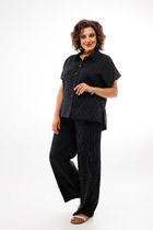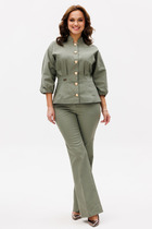 Костюм молодежный из гладкокрашенного тканого полотна «велсофт», состоящий из куртки и брюк. Куртка - прямого силуэта, с длинными втачными рукавами, без воротника с горловиной овальной формы, центральной бортовой застежкой на тесьму «молния». На левой полочке на подгибке, настрочен декоративный элемент.Брюки – длинные, свободные, с карманами в боковых швах и с эластичной тесьмой по талии.