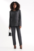 Юбка выполнена в прямом силуэте с эффектным разрезом по переду, который декорирован отделочной тканью «плиссе», придающей дополнительный шарм. Пояс юбки притачной с резинкой сзади обеспечивает комфортную посадку, а боковая молния облегчает надевание. Вся конструкция костюма выполнена на подкладке, что обеспечивает удобство и приятные тактильные ощущения. Такой костюм идеально подходит для офисной обстановки или деловых встреч, сочетая в себе классический стиль и современные акценты.