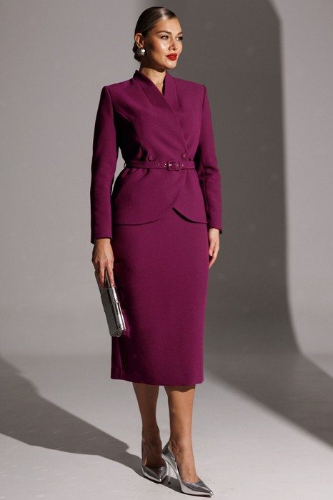 Жакет полуприлегающего силуэта с двухбортной застёжкой на одну пару обтяжных,из основной ткани, пуговиц и одной потайной. Край борта фигурной формы,придающей динамичность жакету. На полочке выполнены фигурные рельефы, которые дополнены функциональными карманами, гармонично вписывающимися в общую структуру изделия. Спинка со средним швом и вертикальными рельефами из проймы. Воротник с цельнокроенной стойкой, что придает жакету элегантный и строгий вид. Рукава двухшовные, со шлицей в локтевом шве на одну пуговицу,также обтяжную из основной ткани.Жакет дополнен шлёвками и съемным поясом из основной ткани с пятью блочками на обтяжную пряжку, чем придает дополнительный акцент на талии.