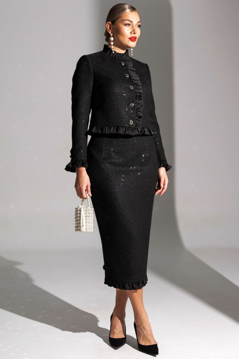 Этот нарядный костюм состоит из жакета и юбки, идеально подходящих для особых случаев. Укороченный жакет полуприлегающего силуэта имеет центральную застежку на пуговицы и детализированную спинку со средним швом и талиевыми вытачками, что подчеркивает фигуру. Перед жакета украшен нагрудными вытачками, а округлый вырез горловины придает ему элегантный вид. Рукава втачные двухшовные, дополненные шлицей в локтевом шве и пуговицами, которые добавляют изящества. Декоративная рюша из атласа обрамляет вырез горловины, край борта, низ жакета и низ рукава, создавая романтичный акцент.