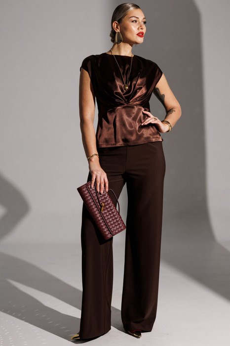Стильный дуэт в трендовом цвете! Блуза выполнена из атласной ткани свободного кроя с немного спущенным плечевым швом,что добавляет расслабленности и воздушности в образ.