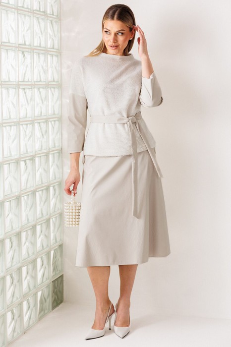 Образ, который стал знаковым - свободный блузон из эластичного полотна в тандеме с юбкой А силуэта из костюмной ткани. Блузон по переду выполнен с нагрудными вытачками выходящими из боковых швов. Спинка со средним швом. Воротник стойка. Юбка на притачном поясе сзади с резинкой. Застежка на тесьму молнию в боковом шве. Комплект дополнен поясом, что позволяет подчеркнуть линию талии. Блузон и юбка на подкладке.