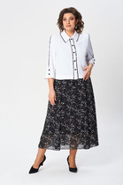 Костюм женский, состоящий из брюк и жилета. Жилет полуприлегающего силуэта с рельефами по переду и спинке, отрезной по линии талии. Низ жилета ассиметричной формы. На баске с одной стороны обработаны прорезные карманы в рамку, один из которых функциональный. Застежка двубортная на петли-пуговицы и декоративную пату. Жилет на подкладке. Брюки прямые, сверху на притачном поясе, сзади с резинкой. На передних половинках обработаны карманы. Застежка на тесьму-молнию. Данный комплект можно дополнить блузой, что позволит Вам создать разные образы.