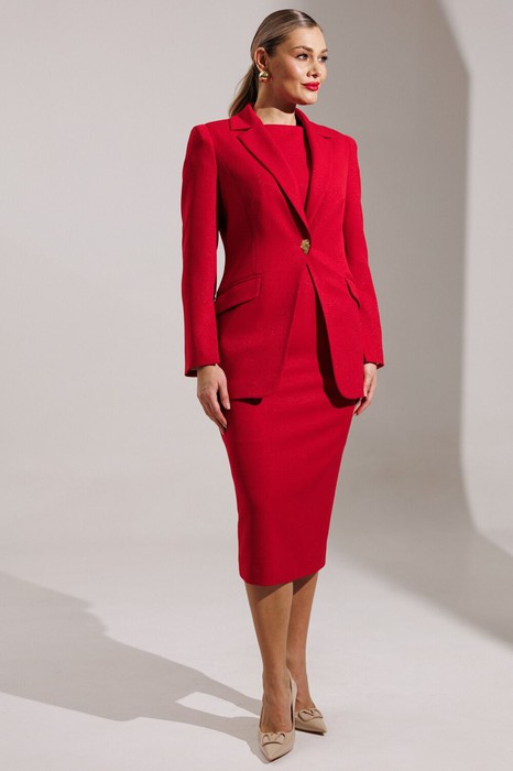 Нарядный комплект, состоящий из жакета и платья. Жакет - воплощение стильной трансформации. Его классический крой выполнен из безупречной трикотажной ткани, но в деталях скрывается своенравный характер. Жакет полуприлегающего силуэта. Модель отличается аккуратным кроем и стильными деталями. На передней части жакета обработаны вертикальные рельефы, идущие от проймы до уровня кармана и от кармана до низа, что придаёт силуэту выразительность и стройность. Воротник пиджачного типа добавляет классической элегантности. Застёжка центральная бортовая на петлю-пуговицу. Карманы в рамке с клапанами, гармонично расположены на передней части жакета. Спинка с центральным швом и вертикальными рельефами, идущими от проймы. Рукава двухшовные с отрезной деталью по окату и разрезами внизу добавляют свободы движению и делают модель более интересной. Жакет на подкладке. Платье женское приталенное  из трикотажного полотна, длиной ниже колена. Рукава короткие - «крылышки». Вырез горловины спереди «лодочкой», сзади - V-образный. Платье приталено вытачками. В среднем шве спинки обработана шлица и потайная молния. Платье на подкладке.