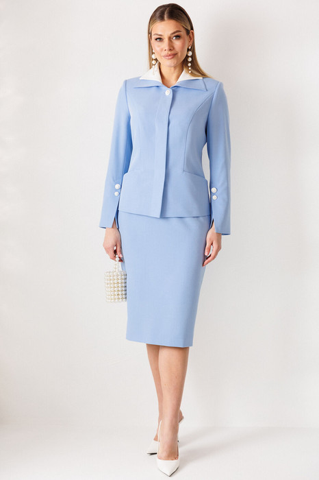 Комплект, состоящий из жакета и юбки. В жакете по переду рельефы, выходящие из проймы и переходящие в линию кармана. По линии входа в карман вставлен регилин для создания модной формы жакета. По спинке средний шов и талиевые вытачки для поддержания полуприлегающего силуэта. Жакет на потайной застежке и на отделочной пуговице у горловины. Декоративным элементом является наличие двух воротников, один из которых из отделочной ткани. В жакете рукава двухшовные. В передних швах рукавов обработаны шлицы с двумя декоративными пуговицами. Юбка прямая, чуть зауженная к низу. По задней половинке юбки застежка на потайную молнию и шлица. пояс притачной, с застежкой на пуговицу и резинками по бокам. Жакет и юбка на подкладке.