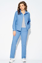 Туника полуприлегающего силуэта . Спинка со средним швом и талиевыми вытачками. По переду выполнены нагрудные вытачки, которые выходят из боковых швов. Низ туники ассиметричной формы. Вырез горловины округлой формы. Брюки прямые, слегка зауженные к колену. На притачном поясе сзади с резинкой. Брюки с карманами. Застежка на тесьму молнию. Костюм декорирован съемной брошью.