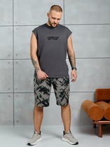 Костю мужской из трикотажного полотна "кулирка", состоящий из футболки и шорт. Футболка классического покроя, с короткими втачными рукавами и приспущенной линией плеч, горловиной овальной формы, обработанной втачной планкой и принтом на детали переда, выполненным в технике шелкографии. Нижние срезы рукавов и изделия обработаны подгибкой. По горловине настрочена отделочная строчка. Шорты длиной до колен, на притачном поясе с эластичной тесьмой внутри, с карманами в боковых швах. Нижние срезы обработаны подгибкой.