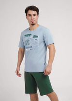 Костюм мужской, состоящий из футболки и брюк. Футболка однотонная с принтом на груди; модель свободная, со спущенной линией плеч, овальным вырезом горловины. Брюки из полотна с набивным рисунком эксклюзивного дизайна, прямые, с боковыми карманами с обтачными входами, на притачном поясе с отстроченной эластичной тесьмой.